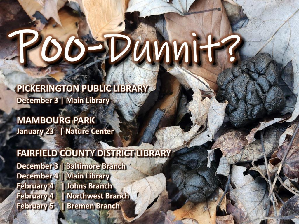 Thanks to Fairfield County District Library and Pickerington Public Library for allowing us to conduct this program at their locations. Questions about the program may be directed to Park District staff at 740 215-6645 or by email to education@fairfieldcountyparks.org. Questions about the libraries, their policies, hours, locations, etc. should be directed to them.