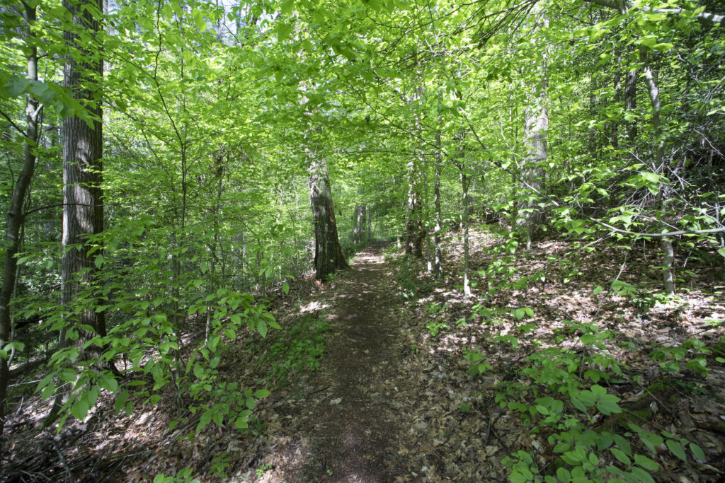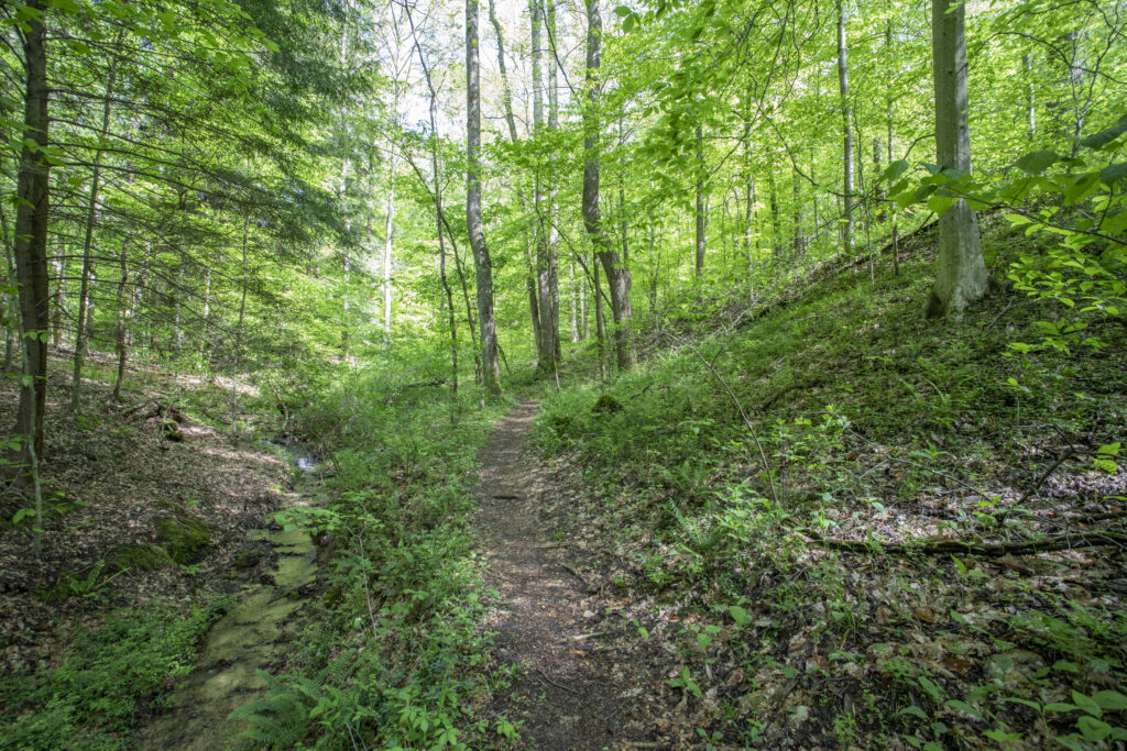 Sights: Hikers can expect to see ephemeral spring flowers including large-flowered trillium and bloodroot, mature oak trees, birding opportunities, footbridges, forested areas, meadow, plus other park features. Pets are not permitted on this trail.